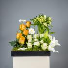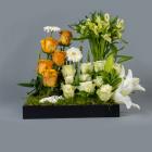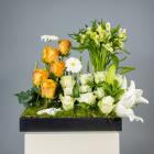 A tray filled with roses, alstroemerias, lilies and gerberas.