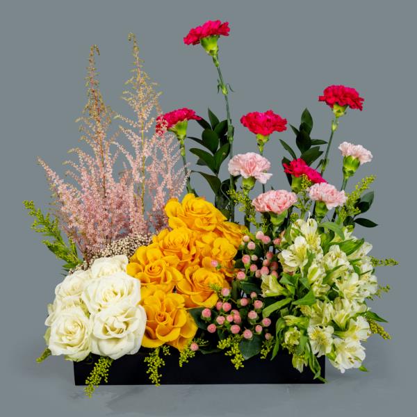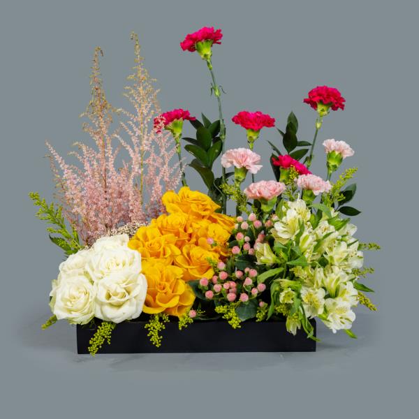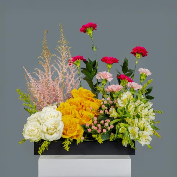 A black wooden tray featuring a soft and stylish mix of astilbe, carnations, alstroemerias, and roses. A refined arrangement with delicate textures and timeless beauty.
