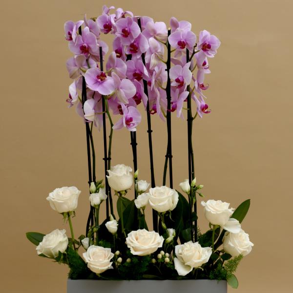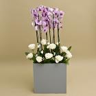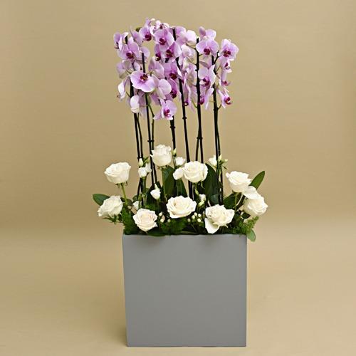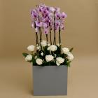 A soft and elegant bouquet in a gray wooden box, combining pink orchids and white flowers for a calm and balanced look.