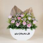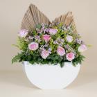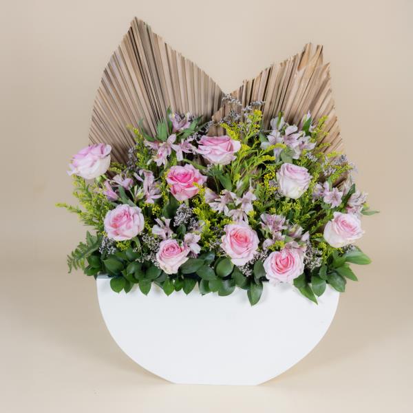 A bouquet containing roses and alstroemerias with dried palm leaves arranged beautifully in a box.