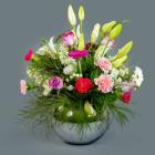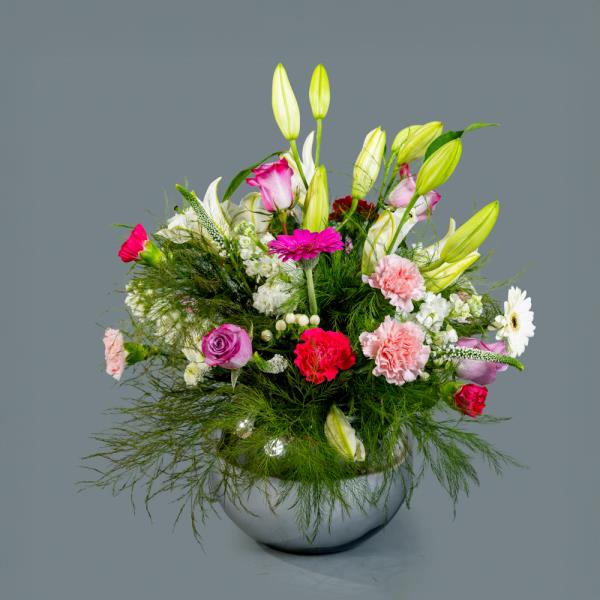 A sleek silver vase featuring an elegant blend of casablancas, roses, carnations, gerbera, and matthiola. A luxurious arrangement full of grace and fragrance.