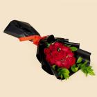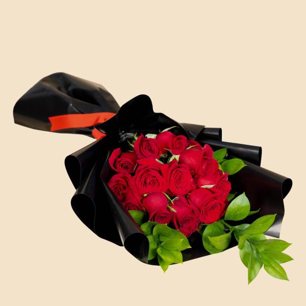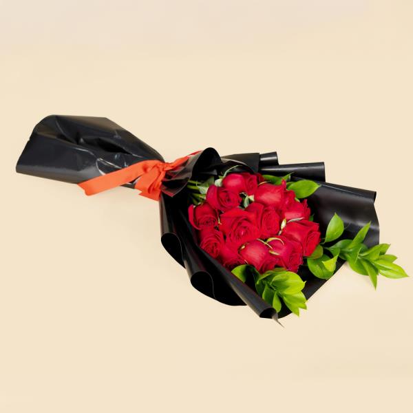 An elegant bouquet of red roses with fresh ruscus leaves, wrapped in modern black paper and finished with a red ribbon.