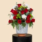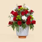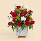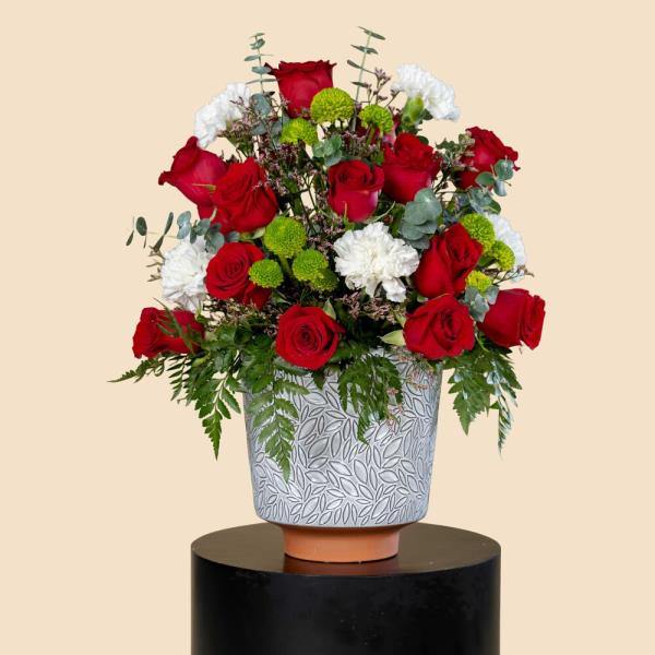 A luxurious arrangement of red roses, white carnations, and fresh green accents, creating a perfect balance between passion and elegance. Beautifully arranged in an elegant ceramic vase, making it rea