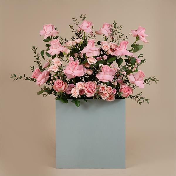 A box of pink roses and pink baby roses are easily attracted your eyes.