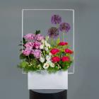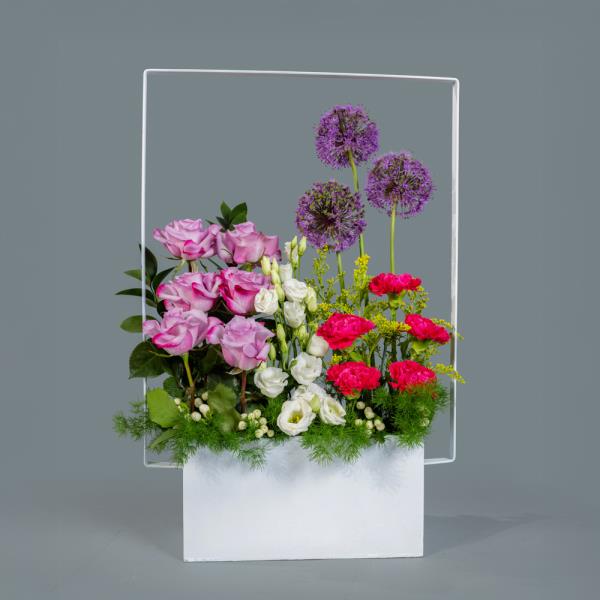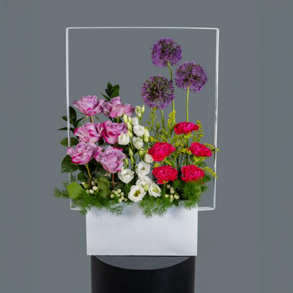 A white wooden box with a metal handle, featuring a charming arrangement of allium, roses, carnations, and lisianthus. A stylish and sturdy design perfect for gifting or decorating.