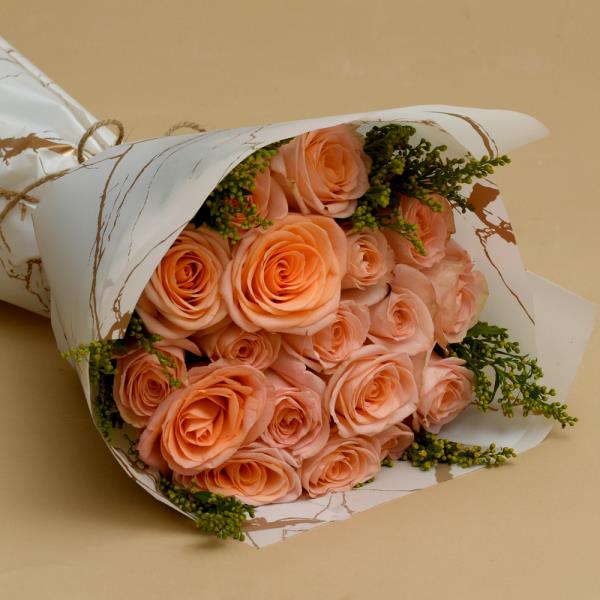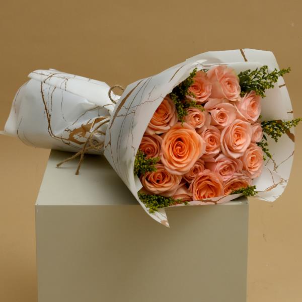 A simple and elegant hand bouquet combining peach roses with a refreshing touch of solidago.