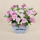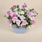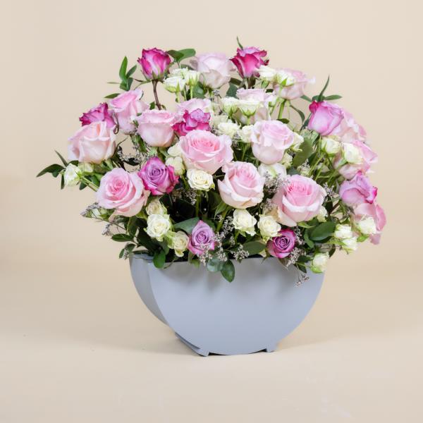 A bouquet containing pink and white roses and baby roses arranged beautifully in a box.
