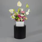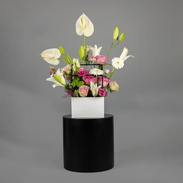 Various flowers such as Lily, Gerbera, Anthurium and Roses in house shape box.