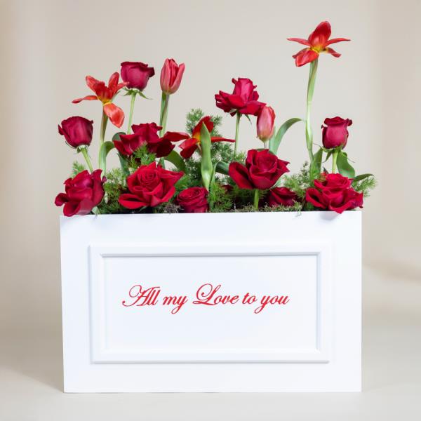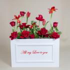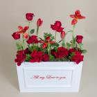 Red roses and tulips arranged beautifully in a box.