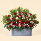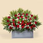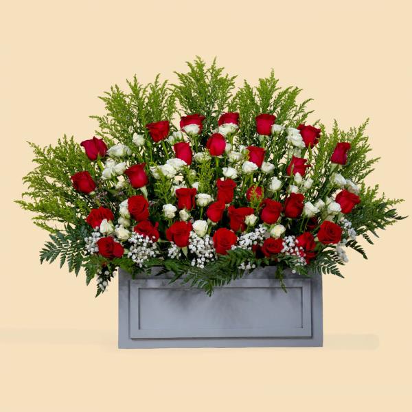 An elegant arrangement of red roses and soft white blooms, presented in a grey wooden box for a refined and timeless look.