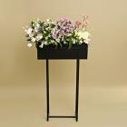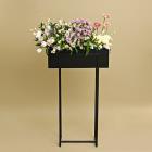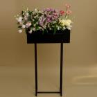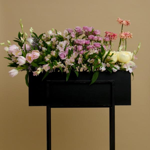A luxurious floral arrangement in soft pink, beige, and purple tones, featuring gerbera, tulips, orchids, and roses, presented in a black wooden box with a sleek iron stand.