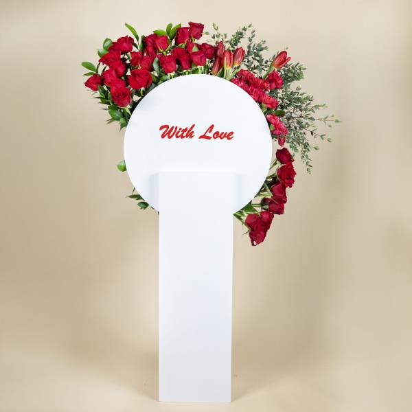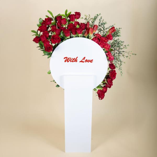 A bouquet containing red roses, tulips, and carnations arranged beautifully on a white stand.