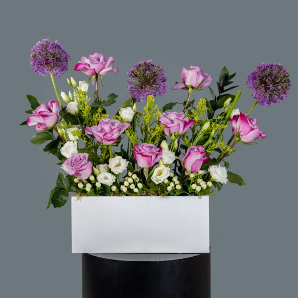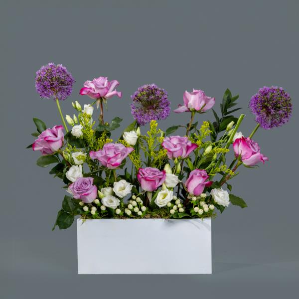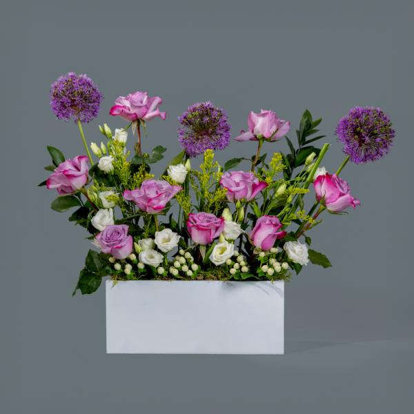 A rustic wooden box containing a refined mix of allium, roses, and lisianthus. A graceful and stylish arrangement, perfect for gifting or decorating.