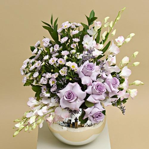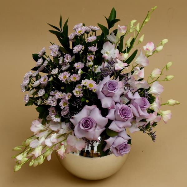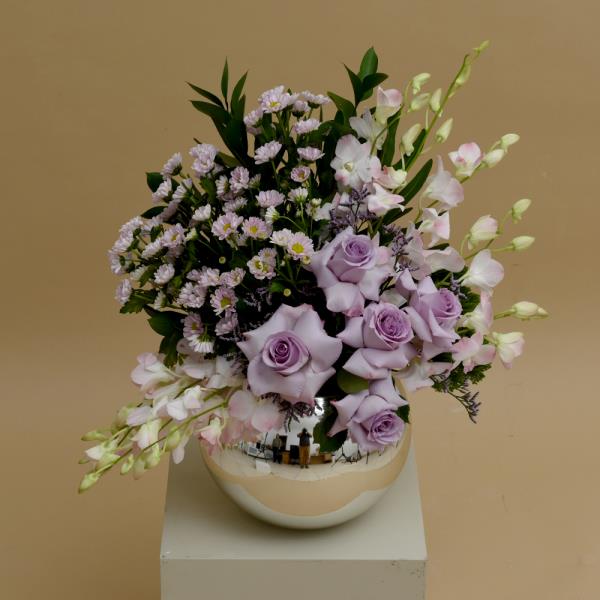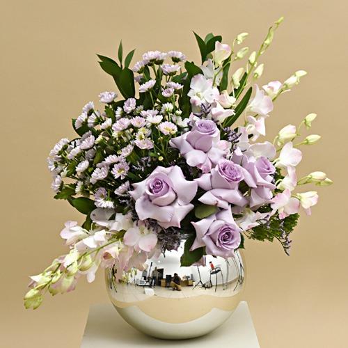 An elegant bouquet combining pink baby orchids, purple roses, purple chrysanthemums, and limonium, with a touch of green ruscus, presented in a silver crystal vase.