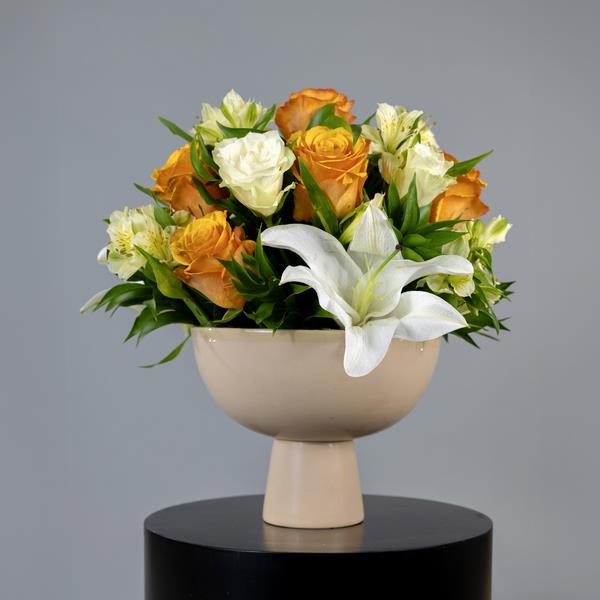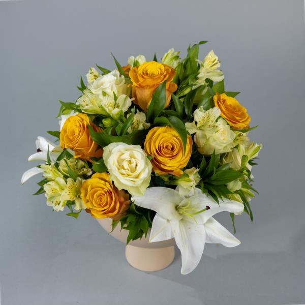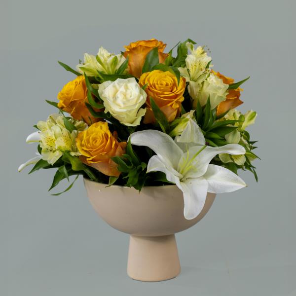 An elegant floral arrangement containing roses, alstroemerias, and lilies, carefully arranged in a stylish ceramic vase.