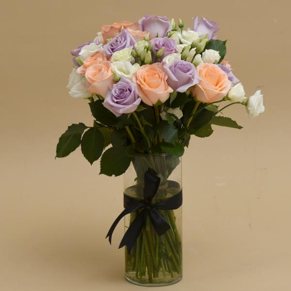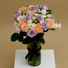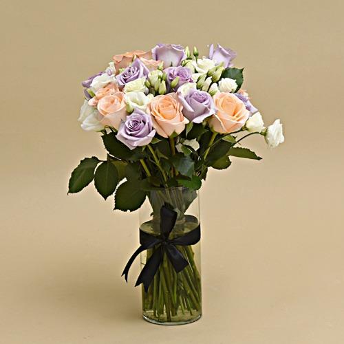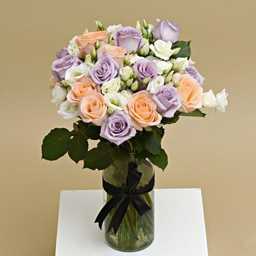 A simple and elegant bouquet featuring purple and peach roses with white lisianthus, arranged in a clear glass vase.