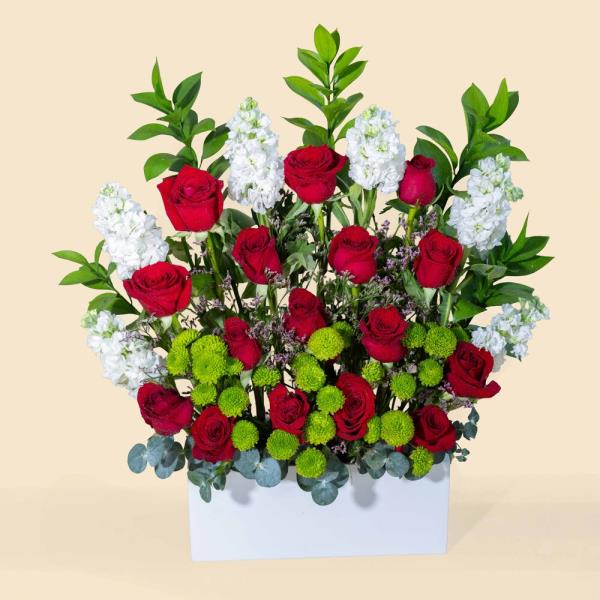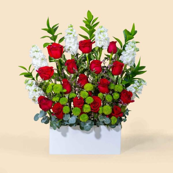 An elegant bouquet blending deep red roses with soft white blooms and fresh green accents. A refined expression of sincere love and timeless elegance, perfect for romantic and special occasions.