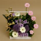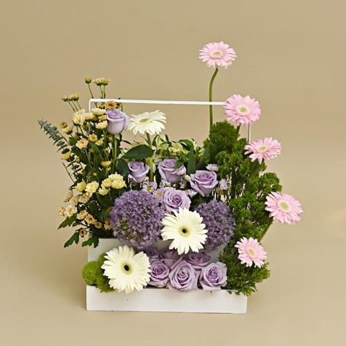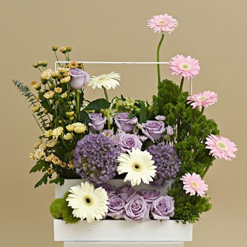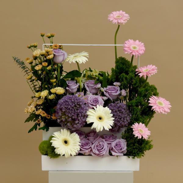 An elegant, modern bouquet featuring purple roses, peach chrysanthemums, and white gerberas, accented with trachelium and allium, arranged in a white wooden box with an iron handle.