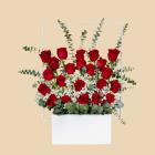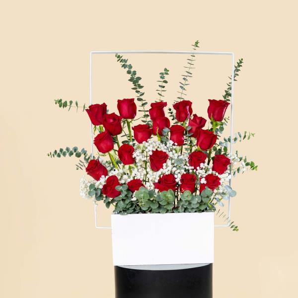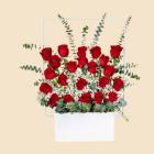 A romantic arrangement of red roses, white baby roses, and gypsophila, presented in a white wooden box with an iron handle for a clean, elegant gift look.