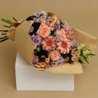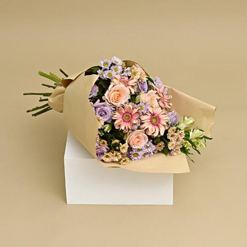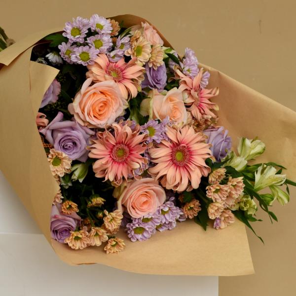 A warm hand bouquet of roses, gerbera and alstroemeria combining peach and purple tones in a natural and elegant arrangement.
