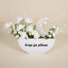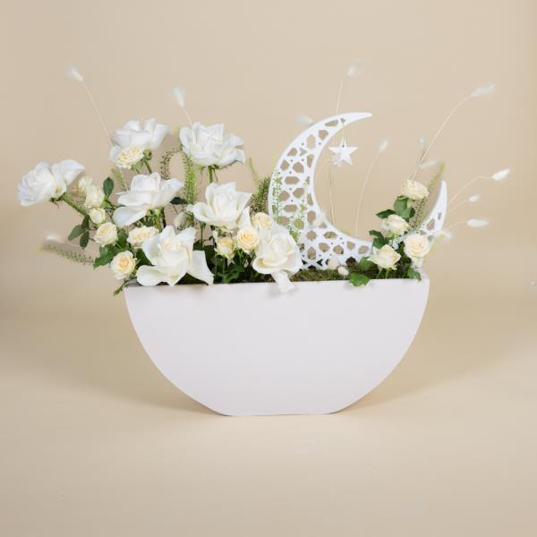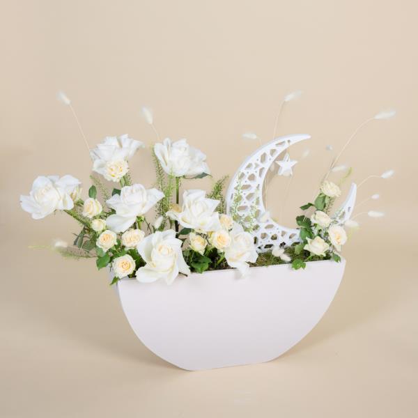 A bouquet containing white roses and baby roses arranged beautifully in a box.