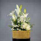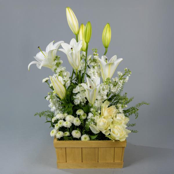 An elegant floral arrangement containing white roses, matthiola, chrysanthemums, and lilies, beautifully arranged in a stylish wooden box. Perfect for gifting a touch of beauty and sophistication.